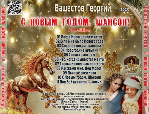 Исполнитель: Вашестов ГеоргийАльбом: С Новым годом, Шансон! (AI edition)Дата: 2025Жанр: ШансонФормат: MP3Качество: 320Размер архива: 111 MBФайлообменники:FTPТреклист:01 Поезд Новогодний мчится